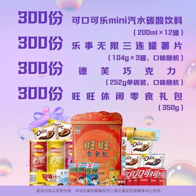 1. 活动时间:即日起至2022年4月3日23:59。2. 活动期间,用户登录“上海嘉定”APP,进入活动页面,选中想要打开的盲盒,点击“打开盲盒”,即可参与活动。3. 每名用户每天可打开1个盲盒。4. 每名用户每天至多有1次中奖机会。5. 奖品分为我“嘉”盲盒与惊喜大礼两种。我“嘉”盲盒设4种奖品,具体奖品设置如下:*我“嘉”盲盒A:可口可乐mini汽水碳酸饮料(200ml*12罐),300份;*我“嘉”盲盒B:乐事无限三连罐薯片(104g*3罐,口味随机),300份;*我“嘉”盲盒C:德芙巧克力(252g单碗装,口味随机),300份;*我“嘉”盲盒D:旺旺休闲零食礼包(350g),300份。惊喜大礼每周设1种奖品。活动周期内,每天投放1个惊喜大礼。6. 所有奖品请以实物为准。7. 奖品自2022年3月7日起陆续发出,于2022年4月30日前完成发放,奖品以快递形式直接寄出。8. 所有奖品将根据中奖人填写的信息发放,请务必及时填写准确的姓名、手机号、收货地址等个人信息,错填、漏填将视为自动放弃。9. 主办方将通过技术筛查手段对参与抽奖用户的真实性进行判断,将对虚假用户、违规用户等进行取消中奖资格、清理账号等处置。10. 嘉定区融媒体中心保留对本次活动的最终解释权。
