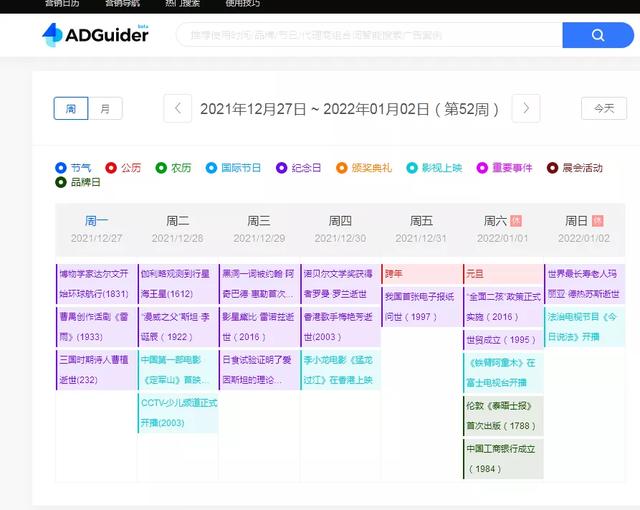 营销热点日历是追热点必不可少的工具,是我见过最全的日历,最适合广告主的热点需求,随时了解节气、国际节日、重要活动、影视节目、广告节等热点机会。