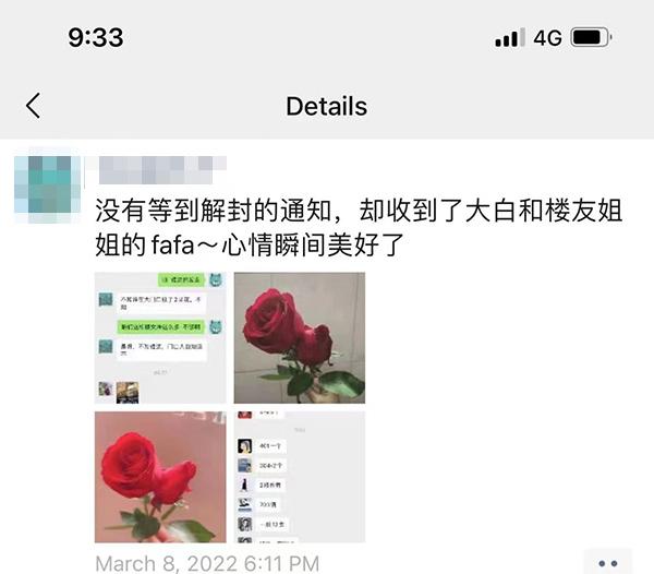 莫莫,29岁,和阿明一样住在唐嫣村。起初,她有点沮丧。在同事朋友的安慰下,她的心情逐渐好转。“领导和同事都很理解我的心情,每天都安慰我,家里工作也很顺利。”沫沫说,隔离期间,楼下的“大白”(基层防疫人员)会帮忙拿物资、拿食物,给他们送花,让她觉得很温暖。