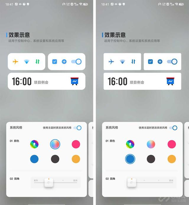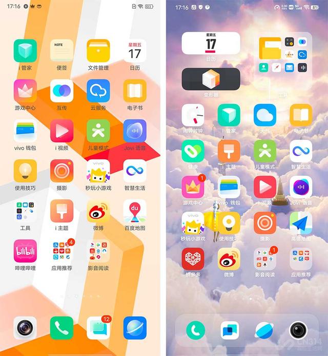 您可以在变形器中更改图标的大小、形状和样式。其中,图标风格有精致和简约两种。精致基本保持了上一代的风格,而简单用一句话总结就是:“过去简单图标不变,复杂图标全部简化”。对比OriginOS之前的图标,可以清楚的看到相册、应用商城、I主题、游戏中心等。都有特效和渐变色,在OriginOS Ocean的简约风格中取消了。每一个图标都是由简单的色块拼凑而成,这会让所有图标看起来比以前更加和谐统一(左边是OriginOS,右边是OriginOS Ocean)。