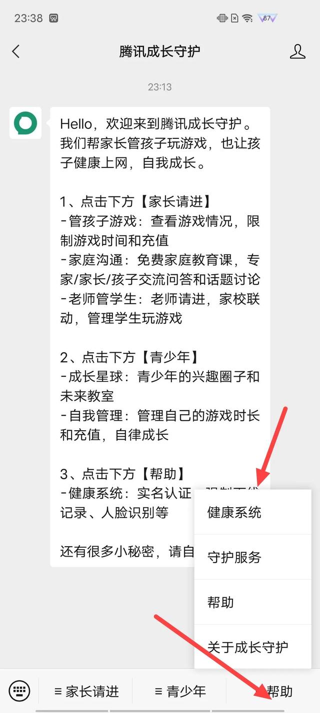 然后进入成长守护平台,点击右下角的帮助,在弹出的界面框中选择健康系统。