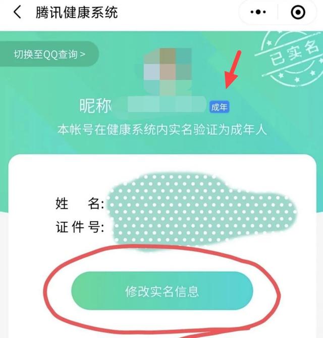 进入实名认证查询后,会显示绑定信息。如果绑定的信息是成人,会显示在昵称旁边,然后点击修改实名认证信息。