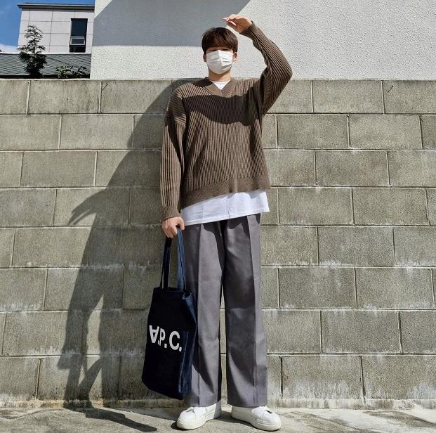 温柔十足风的驼色毛衣,V领款式凸显肩颈线条,内搭白色t恤,简约大气。裤子是浅灰色的裤子,充满了休闲慵懒的韩式气息。最后一双白色帆布鞋收尾,简约又不失高级感。