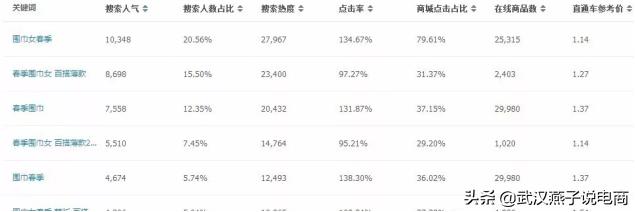 可以看到“丝巾女春天”的搜索热度不错,但是他的线上宝贝比较多,而“春天丝巾女百搭瘦款”的搜索热度比较接近,但是线上宝贝比较少。如果我们的产品接近这个属性,那么选择这个词是一个相对较好的选择。推新品的时候,第一个自然周比较容易爆款。