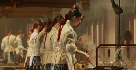 在之前的几集厨房剧里,女性角色的头发上都戴着红色发带,和《大长今》等韩国历史剧里女仆的装扮非常相似。