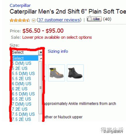 6.比如亚马逊的这款鞋:在其右侧的尺码下拉框中选择尺码;