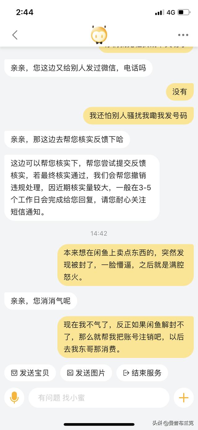 被封的正常人第一个想到的是启封投诉,一次手术后才发现不支持投诉。嗯,我去人工客服解决了。找了半天,联系不上人工客服。此时,边肖内心的怒火正在慢慢积聚,最后闲鱼没有压制住怒火,直接被卸了下来。