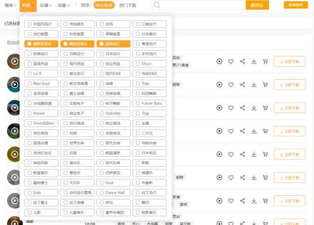 它把音乐分为风格、乐器、场景、意境四类。搜索音乐时,您可以选择多个标签进行过滤: