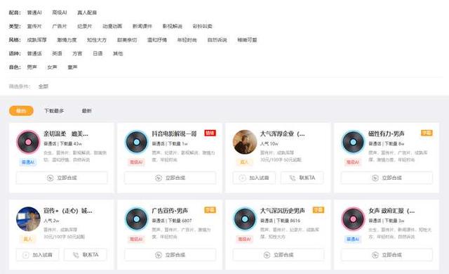 而且它还有一个手机APP,在里面可以选择不同声音类型的主播,也可以根据配音类型选择声音: