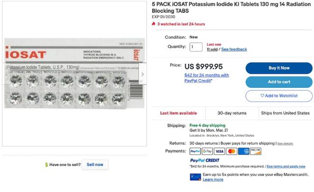 一种“核战争”的恐慌开始在国外民众中蔓延,导致欧美民众抢购防辐射碘化钾的产品,导致这种药物在ebay等网站上的价格是正常价格的10倍以上。