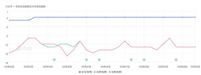 根据麦琪的数据,在2022年2月10日至2022年3月10日这一个月的时间里,小红书除了前几天还保持着社交免费榜前三的位置。