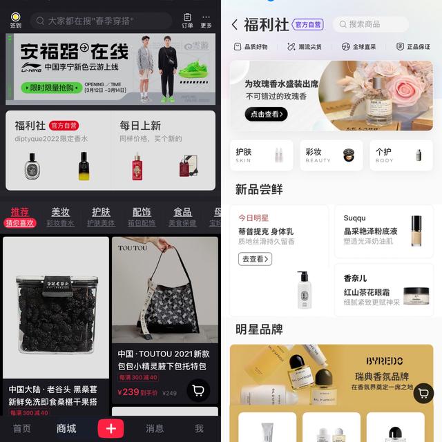 同时,艾媒咨询的数据也显示,2020年,小红书大部分用户购买最多的美容美妆品类是美容美妆产品。福利会有生鲜品鉴、明星品牌、推荐品牌、总裁推荐四大模块。