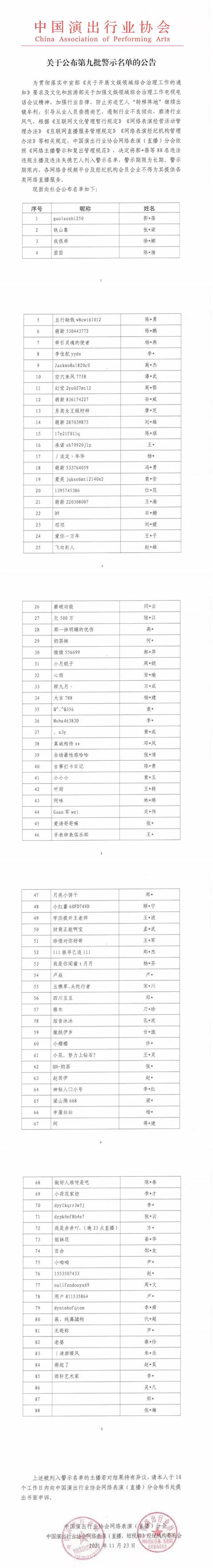 今年以来,中宣部、中央网信办、文化和旅游部先后开展了网络生态治理、饭圈治理和娱乐领域综合治理。在这种背景下,一些网络主播依然我行我素,无视规则,挑战监管,行业对这些行为坚决抵制。根据有关通知要求和会议精神,中国演出行业协会网络表演(直播)分会组织内容审查委员会专家组,按照网络主播警示和回访管理规范进行审查,并经会长联席会议讨论通过,确定了第九批网络表演(直播)行业主播“警示名单”,以防止劣质艺人“转移阵地”继续牟利,引导从业者在清查行业风气中尊重道德,保持行业不正之风。