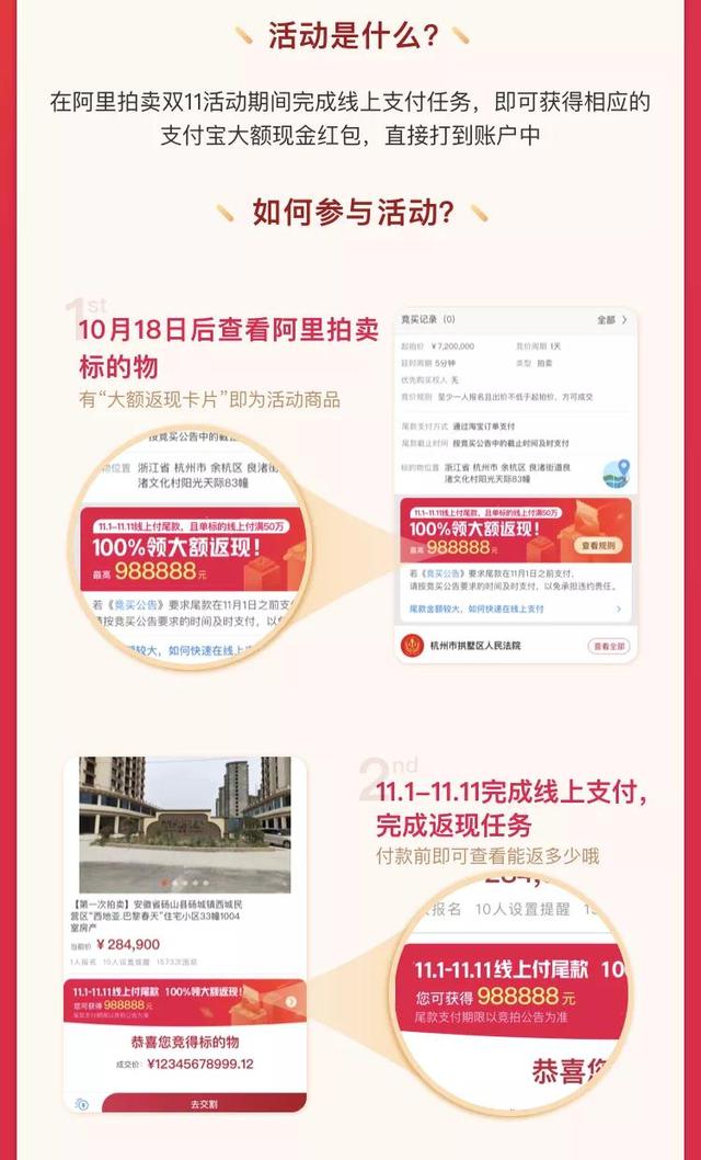 阿里拍卖百万补贴助力司法“互联网+”执行。本活动适用于阿里拍卖平台青岛两级法院拍卖详情页标有“大额返现”的资产标的。订单尾款于2021年11月1日00:00:00至2021年11月11日23:59:59在线支付,单笔订单在线支付总额大于等于50万人民币(含订单尾款和在线支付的定金,或同时满足上述条件,可获得1111元至988888元不等的返现金额。具体规则以阿里拍卖平台在线发布的内容为准。