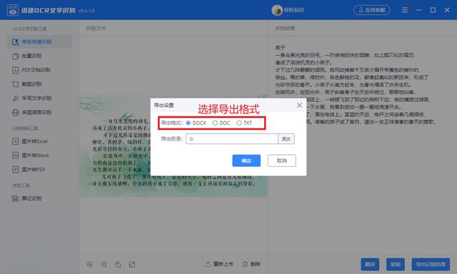 4。如果不需要翻译,只需点击【导出识别结果】即可获得效果。支持TXT、DOC、DOCX格式的导出,非常方便。