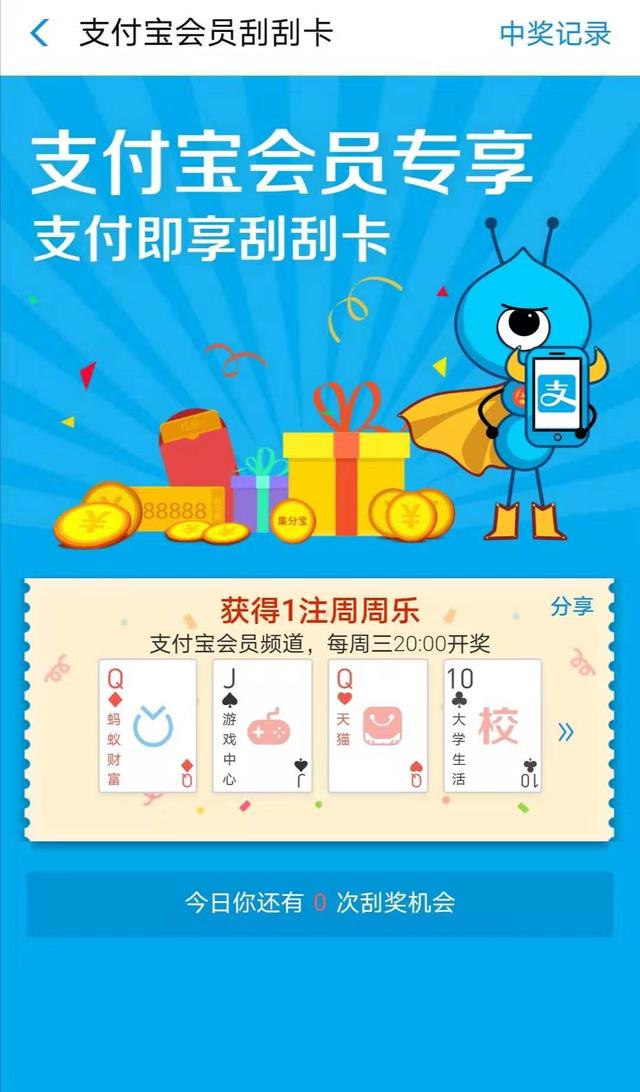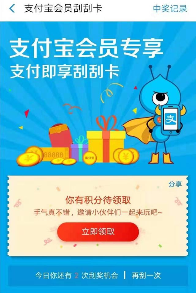 5.活动参与方式:转卡、支付、余额宝转账、信用卡还款、手机充值支付成功页面即可参与活动刮奖;中心的会员刮刮卡活动页面也可以参与活动刮刮奖,只保留当天的刮刮奖机会。
