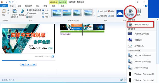 方法三:点击“开始”选项卡下“共享”组中的“保存电影”下三角按钮,在弹出的下拉菜单中点击“建议此项目使用”选项,弹出“保存电影”对话框,设置保存位置和文件名,然后在“保存类型”下拉列表中选择要保存的类型,最后