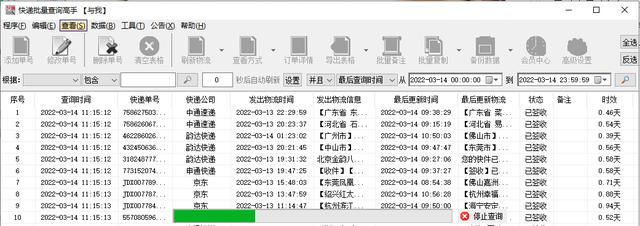 识别保存后,主界面中进度条逐一滚动,表示正在查询所有快递单号。