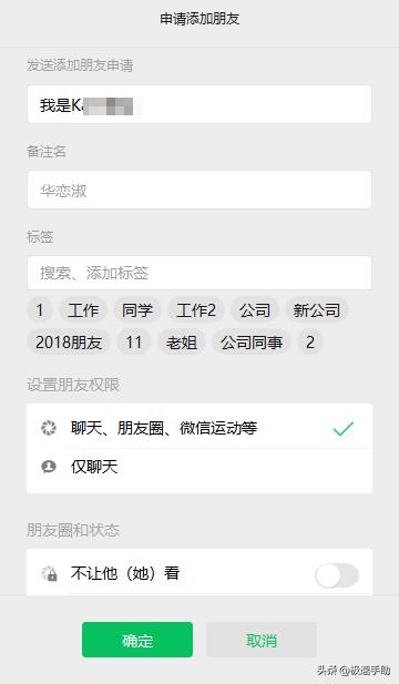 4.最后在弹出的申请添加好友界面中,输入具体内容,备注姓名,标签并设置好友权限,最后点击确定即可。最后,好友通过我们申请添加好友后,可以直接成为微信好友。