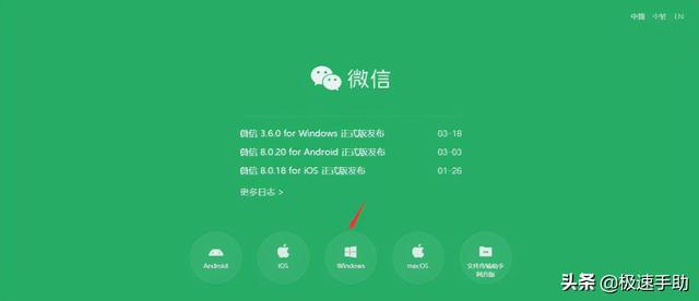 如果想把Windows电脑上的微信更新升级到3.6.0最新版本,有两种升级方式。一种是直接去官网下载最新版本的微信,在浏览器中输入微信,找到官网,然后点击首页底部的Windows图标。