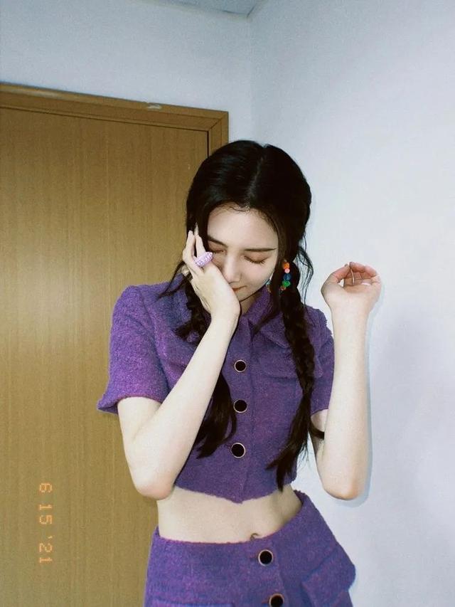 宋妍霏的复古紫色套装真的很独特。黑色纽扣的紫色调显得奢华,而短上衣+迷你裙的设计极具装饰性。