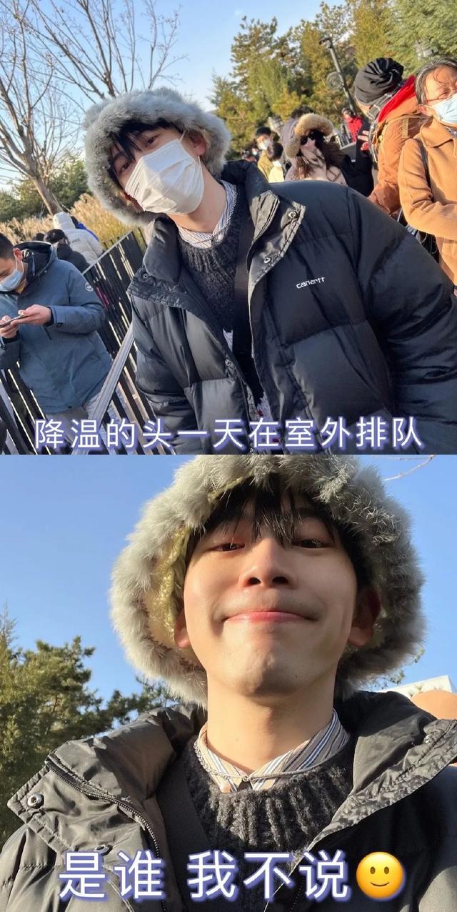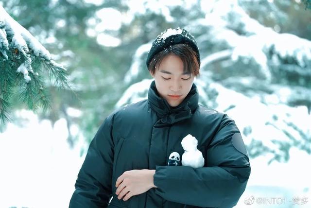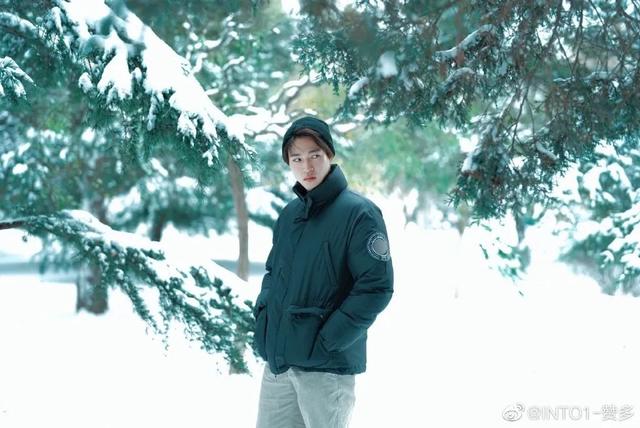 朱之鑫灰色毛衣叠搭黑色长款羽绒服,给普通基础款增加了层次感,初雪中干净帅气。
