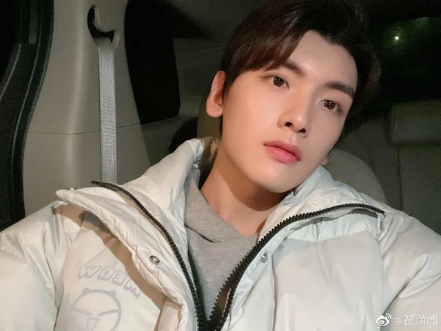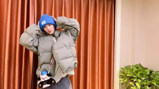 张继的羽绒服印有蓝天白云,让人感受到冬日里的明朗和少年的清爽气质。
