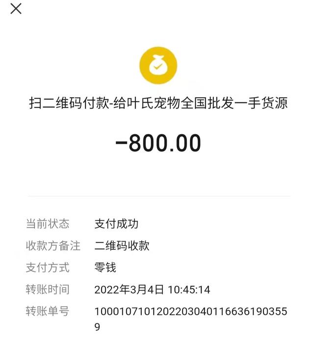 于是我联系了几次售后,售后同意补办一只狗。3.4我向卖家支付了800元。