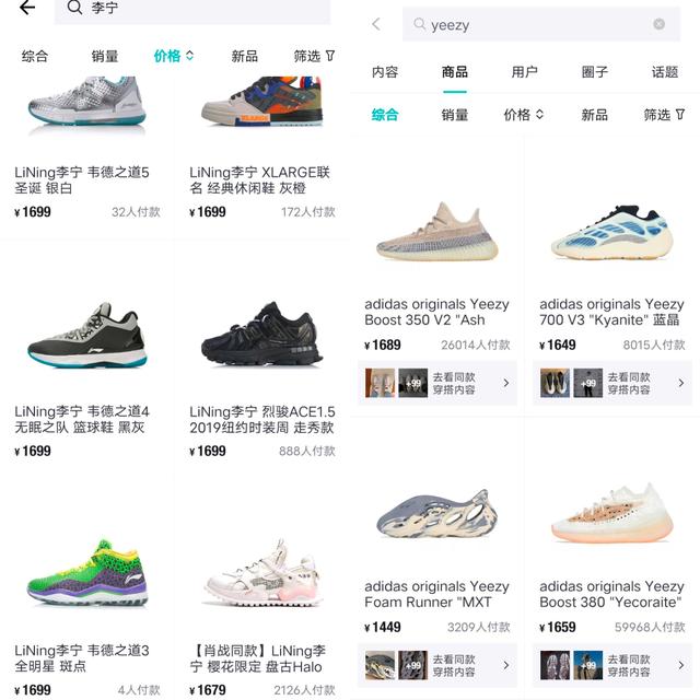 比如打开“拿东西”App,就能以同样的价格买到宁和阿迪的YEEZY。阿迪的销量比李宁高。同时期YEEZY灰珍珠销量高达26014对,而李宁樱花限量2126对。在这样的环境下,李宁应该更受欢迎。但是不存在李宁销量上去的情况。估计李宁的价格没有被更多的消费者接受。