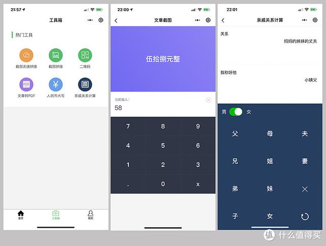 此外,这个小程序有一个工具箱按钮,它涵盖了六个有用的功能。分别是截图无缝拼接、二维码生成、文章转换成PDF、人民币大写、相对计算器等。一个比一个实用!