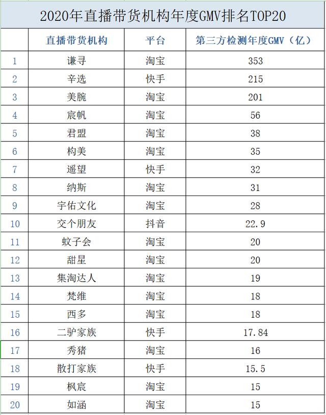 此外,据第三方统计,2020年直播投递机构GMV排行榜前20名中,淘宝的MCN将占据15席,数量上绝对占优。