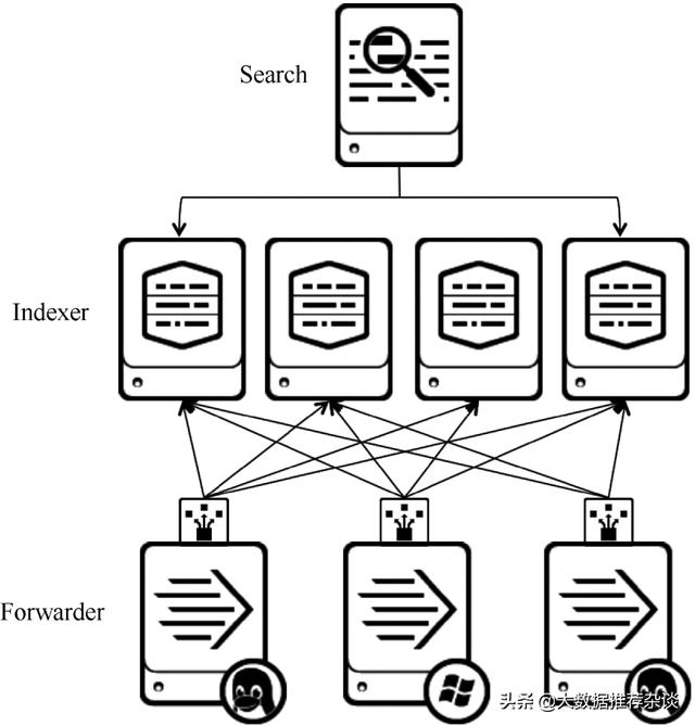 在商业大数据平台产品中,Splunk提供完整的数据采集、数据存储、数据分析和处理以及数据呈现能力。Splunk是一个分布式机器数据平台,有三个主要角色。Splunk架构如图6所示。