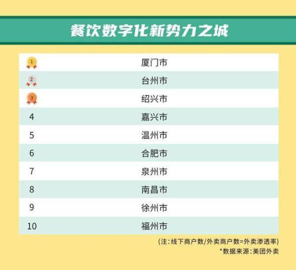 值得一提的是,近三个月,厦门、台州、绍兴的外卖渗透率(城市外卖商户数量/到店商户数量)位列全国前三,线上线下融合更快、更广、更深,是当之无愧的“餐饮数字化新势力之城”。