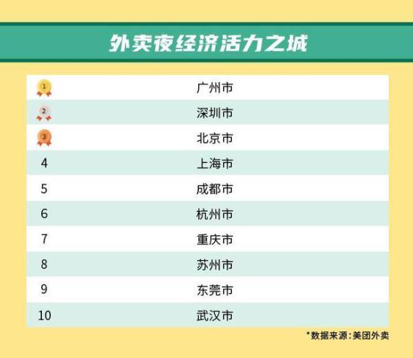 夜宵依然是外卖的重要场景。据统计,夜单量排名前十的城市分别是广州、深圳、北京、上海、成都、杭州、重庆、苏州、东莞、武汉,除北京外均在南方。