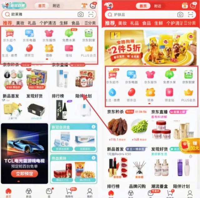 可以明显地看出,与改版前的页面相比,改版后的页面不仅直接取消了搜索栏下方的焦点大图,将由京东超市、京东电器、京东服饰等组成的分类板块上移,而且在其下方还加入了兼具秒杀、直播、好货、排行榜等功能的“四宫格”功能板块。