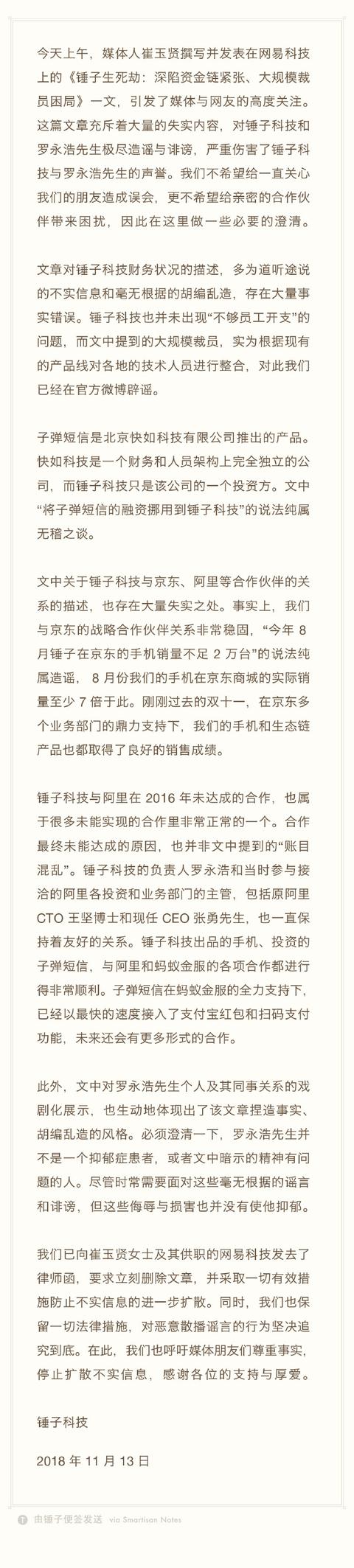 罗永浩、锤子发声明:资金断裂和裁员不实,已向媒体发律师函