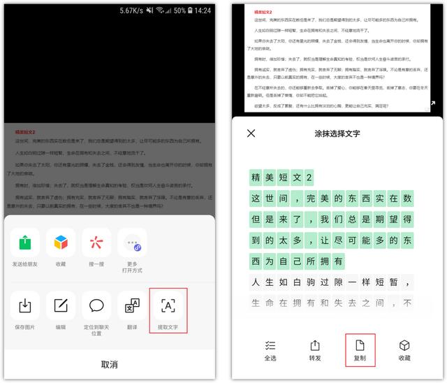 点击图片一下,使图片呈现大图模式显示,然后长按图片大概两秒钟的时间,选择识别图中文字,就能将文字内容复制下来,保存为电子档。
