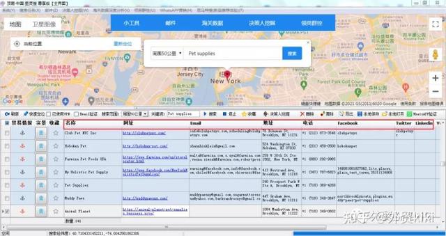 第一步:定位纽约这个城市,输入关键词(不限制产品,行业),就可以搜索到公司名称,网站,邮箱,电话,社交账号信息,导出这些数据就可以直接去联系客户