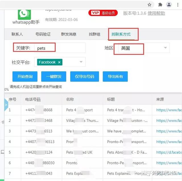 第一步:WhatsApp助手通过关键词搜索社交平台上的电话,输入产品关键词,选择英国这个国家搜索,可以搜索到电话,名字等信息,可以导出号码进行验证,或者一键群发