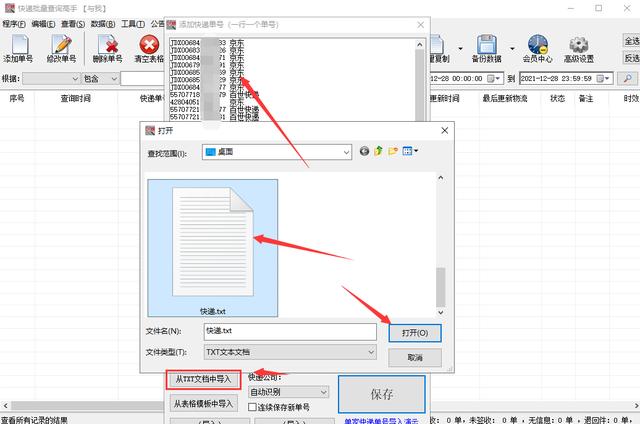 运行快递批量查询高手,其中有多种导入方式,比如第一种,从TXT文档中导入,需要事先将快递单号都保存在同一TXT文档中,然后一键导入