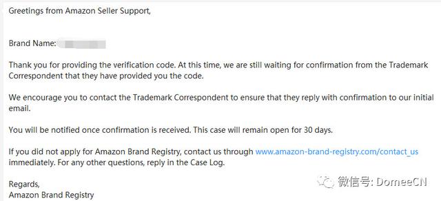 目前主要是针对美国站点。整体上品牌备案的特权和步骤都是没有太大改变的,但五一期间我们收到买家反馈,他在4月26日提交的品牌备案,在我们提供verification code给他,然后提交平台之后,亚马逊给他回复了一个邮件: