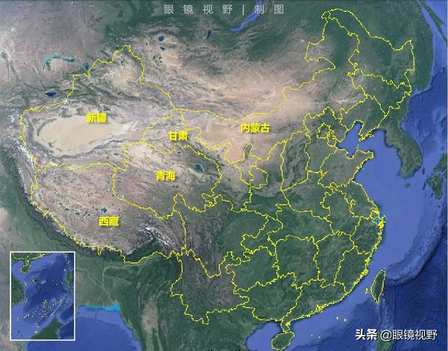 而这些因素又是由天然的地理环境所致。打开中国的卫星地图,你会发现西藏、新疆、内蒙古、青海、甘肃几个省份,绝大多数地区都是土黄色,与之对比内地省份都是绿色。