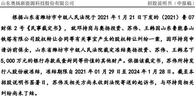 除了财务上的问题,奥扬科技在司法方面也存在一些问题。招股书中披露:根据山东省潍坊市中级人民法院于2021年1月21日下发的(2021)鲁07财保2号《民事裁定书》,就邓持岗与奥扬投资、苏伟、王韩因山东鲁能泰山 铁塔有限公司股权转让合同等有关事宜产生的股权转让纠纷一案,因邓持岗申请诉前保全,山东省潍坊市中级人民法院裁定冻结奥扬投资、苏伟、王韩名下5,000万元的银行存款或查封同等价值的其他财产。依据该裁定书,苏伟所持发行人股份被冻结,冻结期限自2021年01月29日至2024年1月28日。