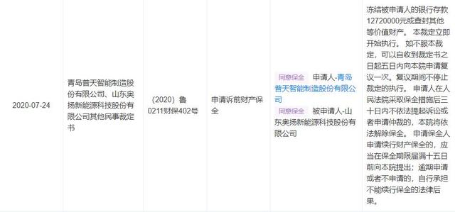 2020年7月24日,山东省青岛市黄岛区人民法院下发的裁定书((2020)鲁0211财保402号)显示,青岛普天智能制造股份有限公司(以下简称青岛普天)申请诉前财产保全,请求冻结奥扬科技的银行存款12720000元或查封其他等价值财产。