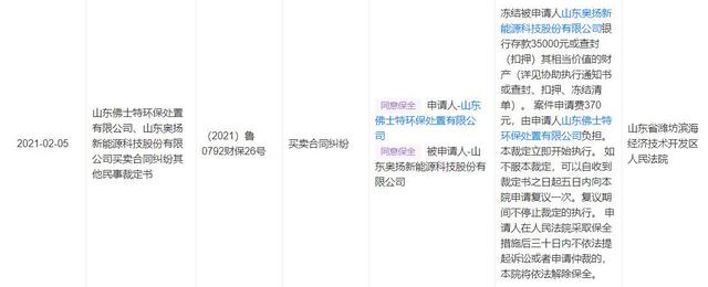 而这仅是其中之一,根据天眼查披露的数据,近几年奥扬科技多次因为合同纠纷被法院冻结财产。2021年2月5日,山东省潍坊滨海经济技术开发区人民法院下发裁定书,冻结被申请人山东奥扬新能源科技股份有限公司银行存款35000元或查封(扣押)其相当价值的财产(详见协助执行通知书或查封、扣押、冻结清单)。案件申请费370元,由申请人山东佛士特环保处置有限公司负担。本裁定立即开始执行。