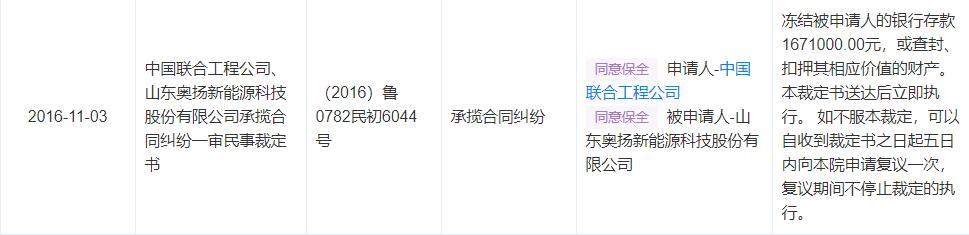 更早的一次可追溯至2016年,当年11月3日,诸城市人民法院下发中国联合工程公司、山东奥扬新能源科技股份有限公司承揽合同纠纷一审民事裁定书。冻结被申请人山东奥扬新能源科技股份有限公司的银行存款1671000.00元,或查封、扣押其相应价值的财产。本裁定书送达后立即执行。