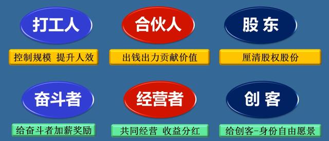 我们讲打工人,打工人基本上都拿着固定工资,或拿计件工资,又比如合伙人,合伙人是分红为主的奋斗者,努力工作创造好的价值跟结果,是用结果效果来付费,经营者是需要对整体的经营成果负责的人,股东是需要承担风险的人,创客是公司平台当中一起来创业的人。