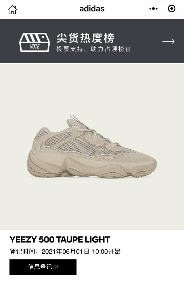 目前,这款 Yeezy 500 "Taupe Light"全新配色已经正式上架 adidas 小程序开启预约登记,登记截止至 6 月 3 日 12 点,将于 6 月 3 日 13 点开始预约,这次发售将在全国 108 个城市开启,货量应该不错,又到拼手速的时候了!