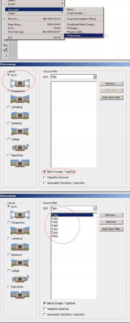 下面我们用Photoshop拼接全景图,这是比较自动化的一个过程。打开Photoshop,选择“文件-自动-Photomerge”。会出现一个两栏窗口。左栏上的选项是拼合的光学模式,你可以选择几种自定义模式,一般我们选择“自动”,当然你也可以选择别的选项。