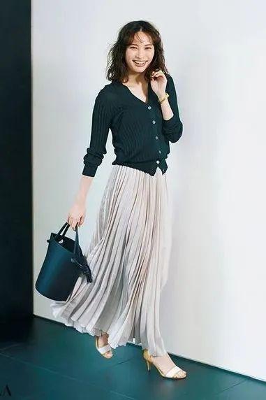 倘若平时多数以通勤为主,基础色奶奶衫+百褶裙,唯美灵动的时尚韵味也能令你在春天美得大放异彩。